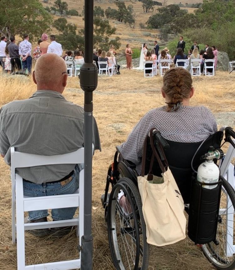 Cathy and Heck had a special area on level land with umbrellas for protection – and a clear view of the ceremony. She had made it to her son’s wedding.